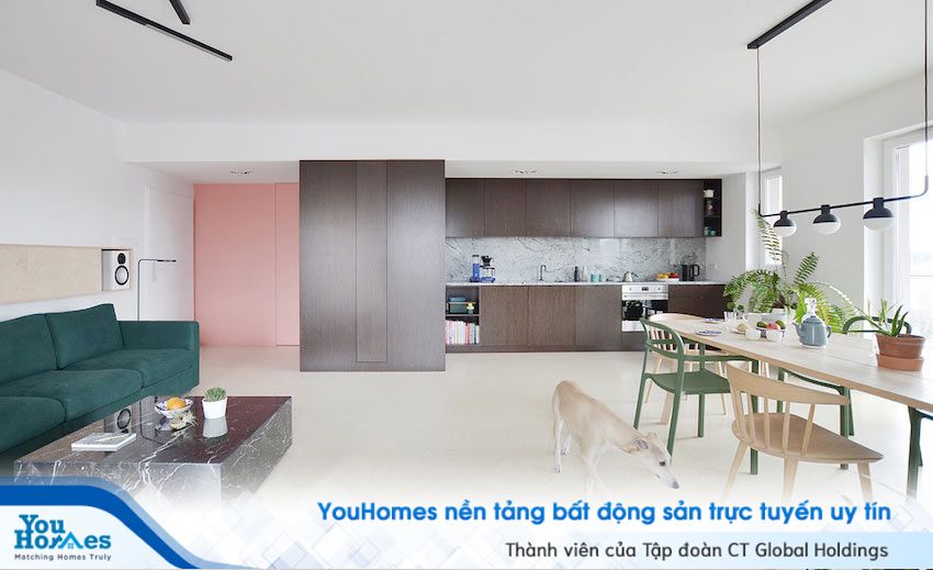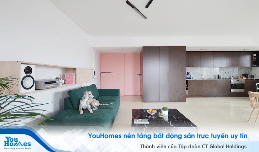 Căn hộ này của một cặp đôi mới cưới được nhóm thiết kế sử dụng màu sắc tươi sáng, đường nét đơn giản để nhấn mạnh sự cởi mở của không gian.