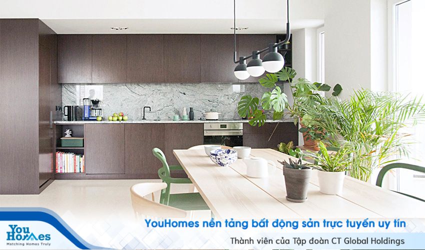 Không gian rộng lớn được bao phủ bởi kết cấu của sàn liền mạch, tủ gỗ màu nâu sẫm và mặt sau bằng đá cẩm thạch để xây dựng nhà bếp, phòng ăn với bàn ăn bằng gỗ sáng màu, trang trí với ghế màu xanh ô liu.