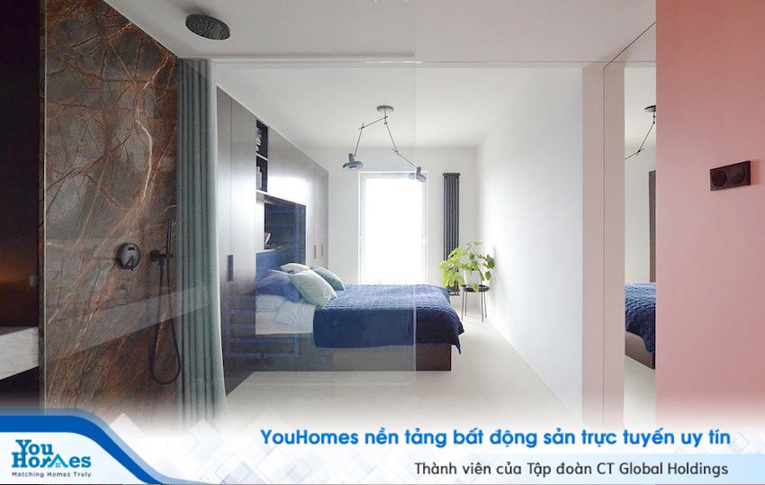 Để có không gian riêng tư, khu vực tắm có rèm ở bên ngoài kính.