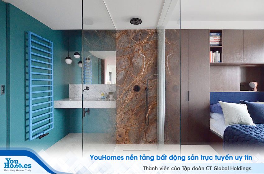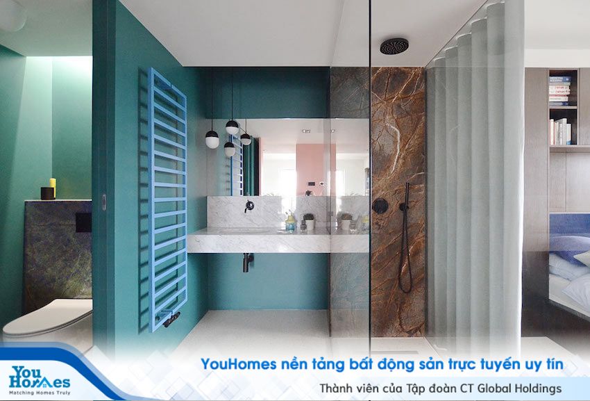 Phòng tắm sang trọng với tường đá cẩm thạch và nổi bật bởi vách ngăn màu xanh.