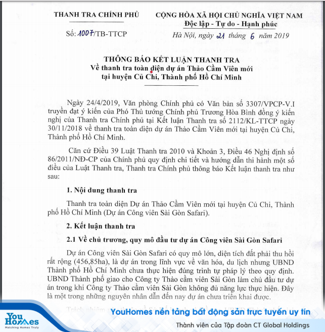 Và đến ngày 21/6/2019, Thanh Tra Chính Phủ đã có thông báo kết luận về thanh tra toàn diện dự án Thảo Cầm Viên mới tại huyện Củ Chi, TP.HCM. Theo đó, Tổng Thanh tra Chính phủ kiến nghị tổ chức kiểm điểm nghiêm túc các tổ chức, cá nhân có trách nhiệm liên quan đến dự án trên vì những sai phạm liên quan đến giao chủ đầu tư không đủ năng lực, chậm trễ trong giải phóng mặt bằng, bồi thường, tái định cư…