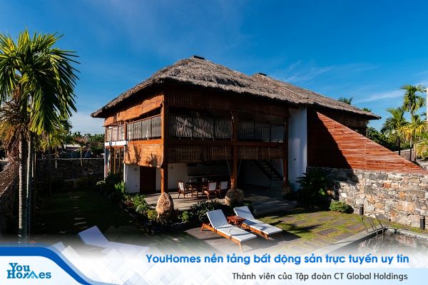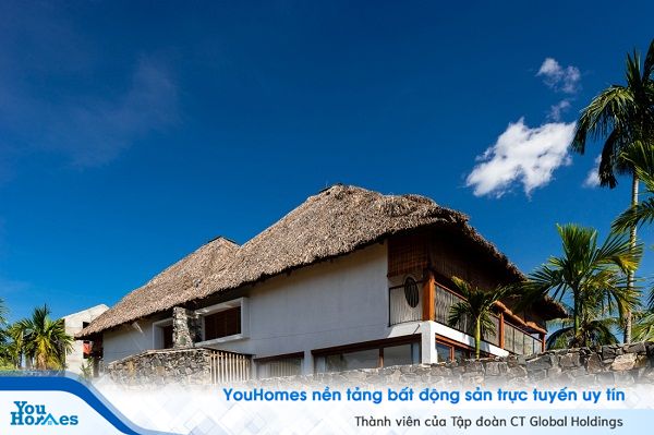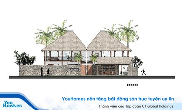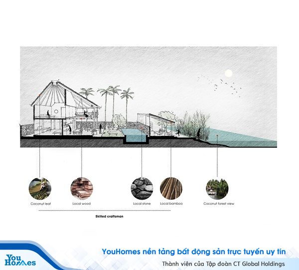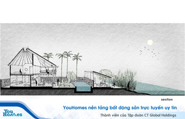 Nhóm kiến trúc sư đề xuất ý tưởng sử dụng mái lá dừa lớn bao phủ các phần chức năng bên dưới, lúc này nhìn xa biệt thự sẽ trông giống như một túp lều lớn.