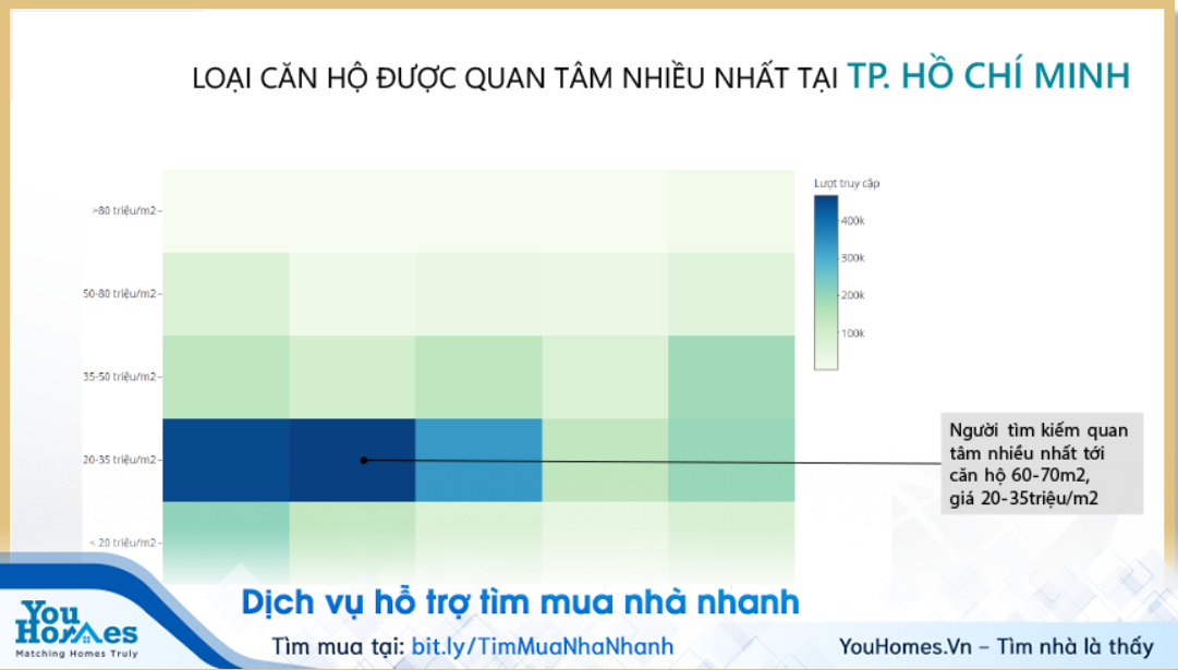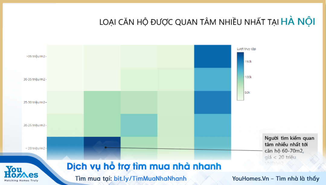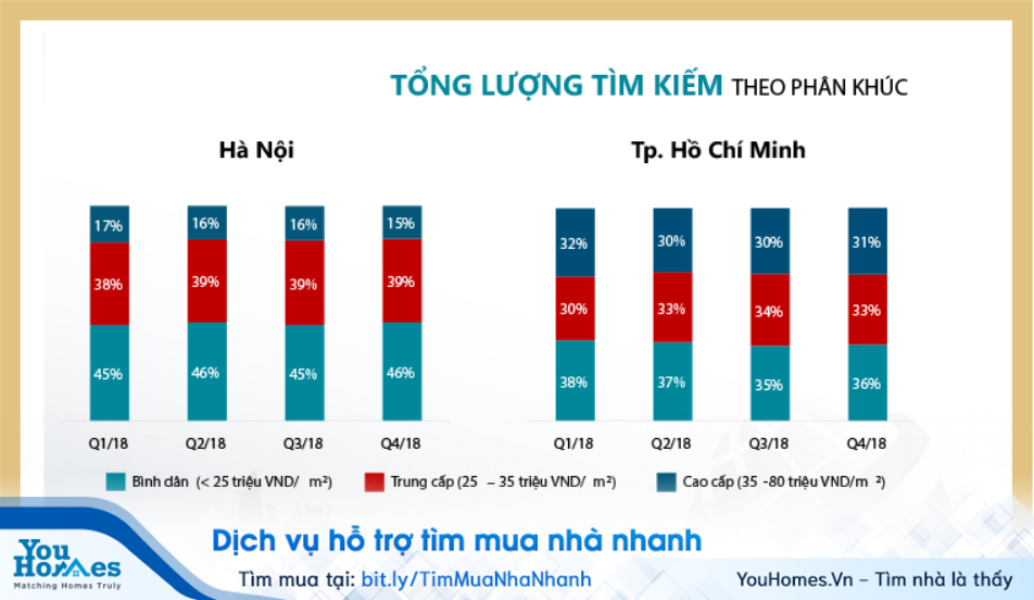 Phân khúc căn hộ bình dân đang đứng đầu về lượt tìm kiếm ở cả Hà Nội và Tp.HCM trong năm 2018. Tỷ trọng tìm kiếm căn hộ bình dân ở Hà Nội trong các quý của năm 2018 dao động từ 45-46%; tại Tp.HCM là từ 35-38%. Ở Hà Nội, người tìm kiếm quan tâm nhiều nhất tới căn hộ 60-70m2, giá thấp hơn 20 triệu đồng/m2. Tại Tp.HCM, người dùng quan tâm nhiều nhất tới căn hộ 60-70m2, giá từ 20-35triệu đồng/m2.