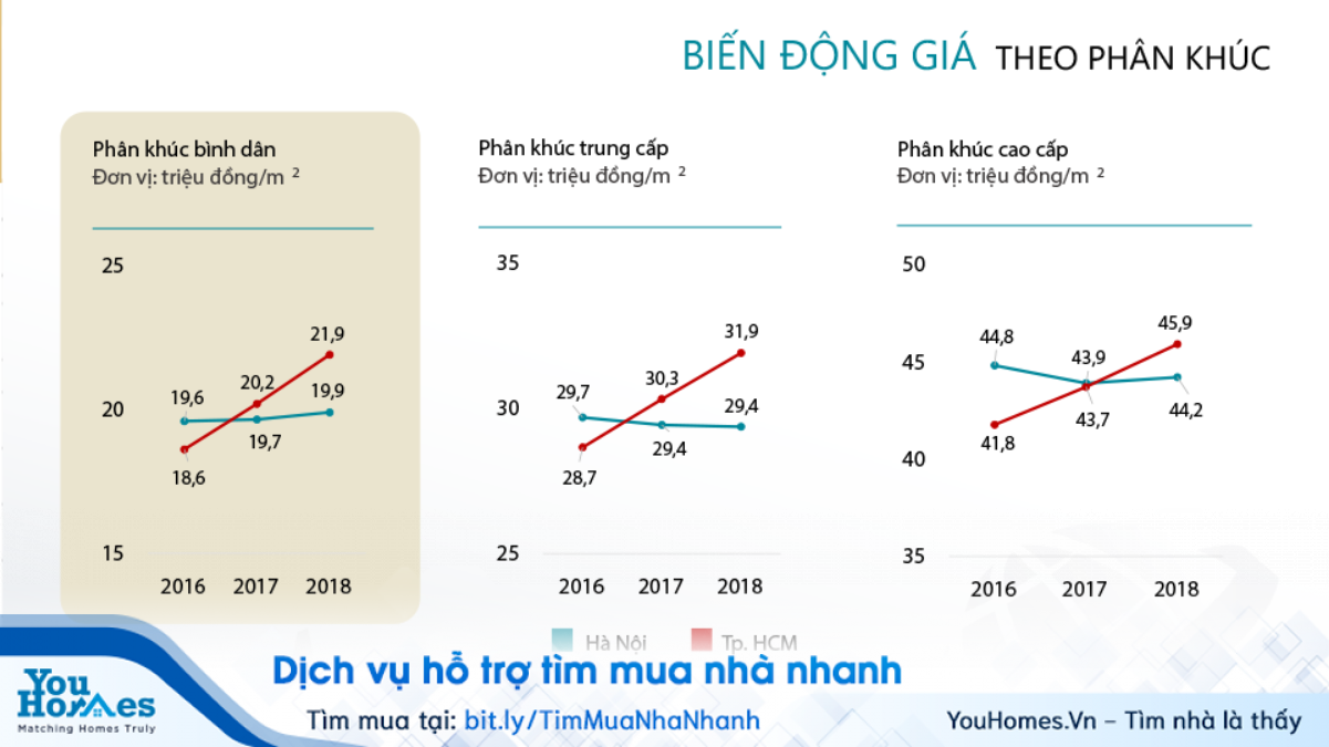 Tại Hà Nội, mức giá căn hộ bình dân đã tăng từ mức trung bình 19,6 triệu đồng/m2 (2016) lên mức 19,9 triệu đồng/m2 (2018). Tại Tp.HCM, căn hộ giá rẻ đã tăng từ mức trung bình 18,6 triệu đồng/m2 (2016) lên mức 21,9 triệu đồng/m2 (2018). Nếu ở Hà Nội, biên độ tăng giá nhẹ thì tại Tp.HCM , mức tăng đạt từ 5% đến 9%/năm.