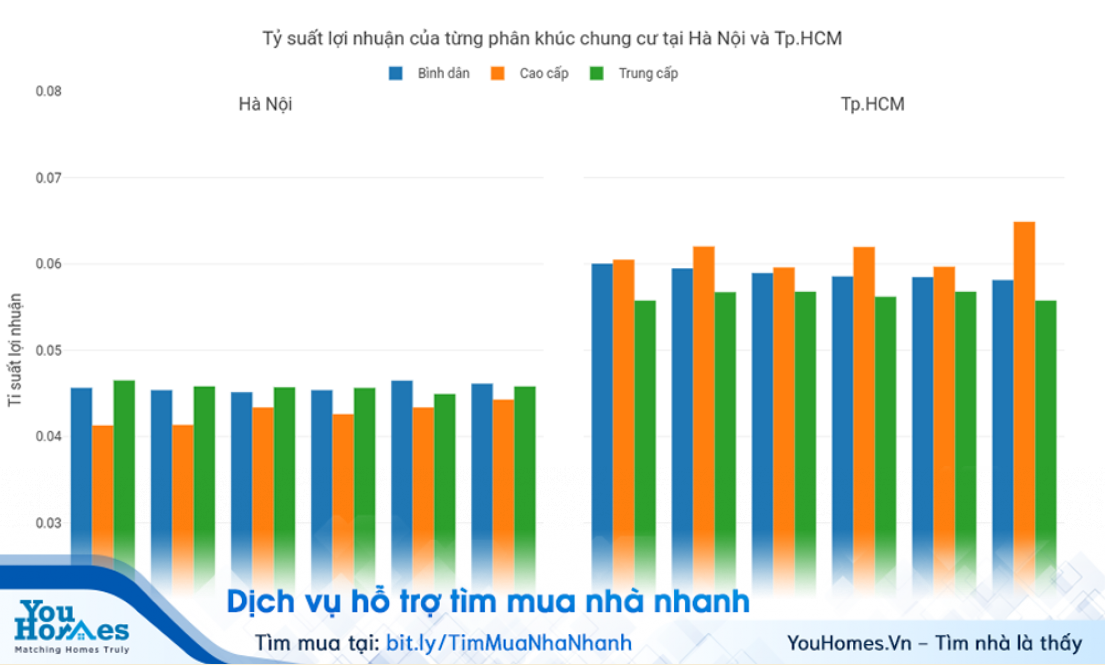 Kết quả nghiên cứu của chúng tôi cho thấy, nếu lấy mức giá trung bình của một căn hộ chung cư bình dân, trung cấp và cao cấp tại Hà Nội và Tp.HCM lần lượt là 1,5 tỷ, 2,2 tỷ và 3,9 tỷ thì mức giá cho thuê tương ứng là 6,5, 9,5 và 17 triệu đồng/tháng. Mức tỷ suất lợi nhuận cho thuê căn hộ trung bình tại hai thành phố này tương ứng sẽ là 5,2%, 5,18% và 5,23%. Như vậy, có thể thấy mức lợi suất này còn không bằng lãi suất gửi tiết kiệm tại ngân hàng.