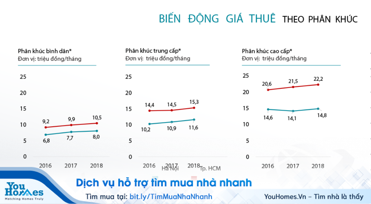 Phân khúc trung cấp ở Hà Nội là 10,2-10,9-11,6 triệu đồng/tháng, Tp.HCM là 14,4-14,5-15,3 triệu đồng/tháng. Phân khúc cao cấp ở Hà Nội 14,6-14,1-14,8 triệu đồng/tháng, Tp.HCM: 20,6-21,5-22,2 triệu đồng/tháng. Mức tăng đều chỉ dao động từ 3-5%/năm. Giá thuê thấp và tăng chậm khiến căn hộ cho thuê không còn là kênh trú ẩn tiềm năng của dòng tiền.