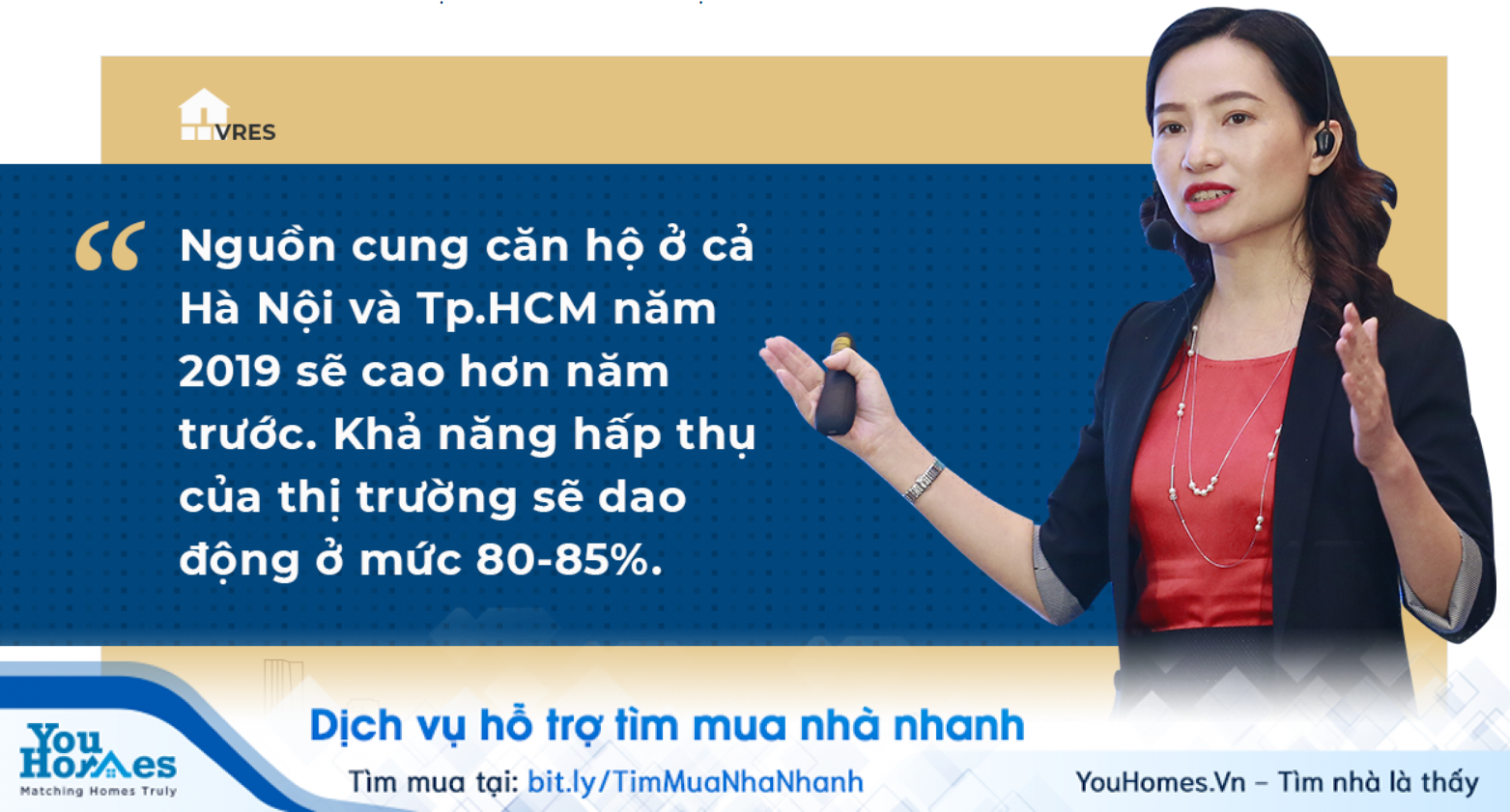 Theo bà Dương Thùy Dung, Giám đốc Cấp cao CBRE, trong năm 2018, một vài dự án vì lí do nhất định đã bị trì hoãn, khả năng cao sẽ bung hàng trong năm 2019. Đây là cơ sở để bà Dung tin rằng nguồn cung căn hộ ở cả Hà Nội và Tp.HCM năm 2019 sẽ cao hơn năm trước. Khả năng hấp thụ của thị trường sẽ dao động ở mức 80-85%. Ngoại trừ phân khúc hạng sang có thể có sự tăng giá đột biến thì tất cả các phân khúc khác sẽ giữ được mức giá bình ổn, đặc biệt là phân khúc bình dân và trung cấp.