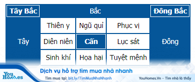 | Cung Cấn | Tây nam | Tây bắc | Tây | Đông bắc | Đông nam | Bắc | Đông | Nam |