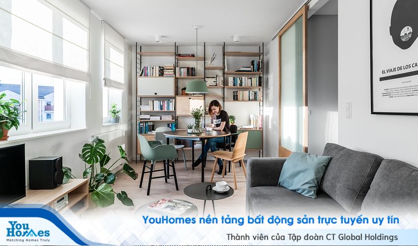 Căn hộ 46m2 này được thiết kế theo phong cách Bắc Âu với nội thất đơn giản nhưng gọn gàng, màu sắc nhã nhặn và tinh tế. Thiết kế cửa và bố trí cây xanh ở tất cả các phòng giúp thoáng đãng và tạo không khí tươi mới cho căn nhà.