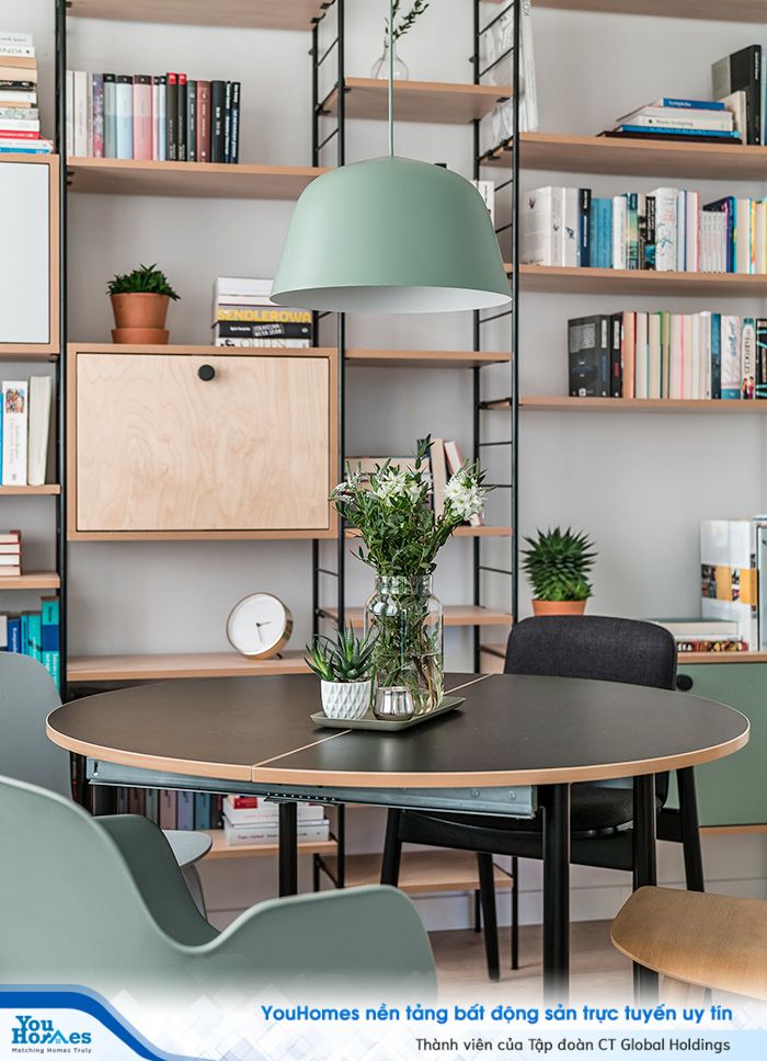Căn hộ 46m2 được thiết kế theo phong cách Bắc Âu với nội thất đơn giản nhưng gọn gàng, màu sắc nhã nhặn và tinh tế. Thiết kế cửa và bố trí cây xanh ở các phòng giúp thoáng đãng và tạo không khí.