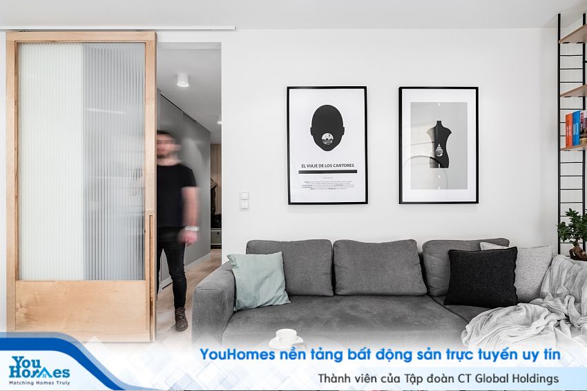 Sự đơn giản và tinh tế là chủ đề trang trí của căn hộ, những sự tinh tế và đơn giản đến từ màu sắc và cả những bức tranh. Cửa gỗ kéo là nơi ngăn cách giữa phòng khách và các phòng khác của căn hộ.