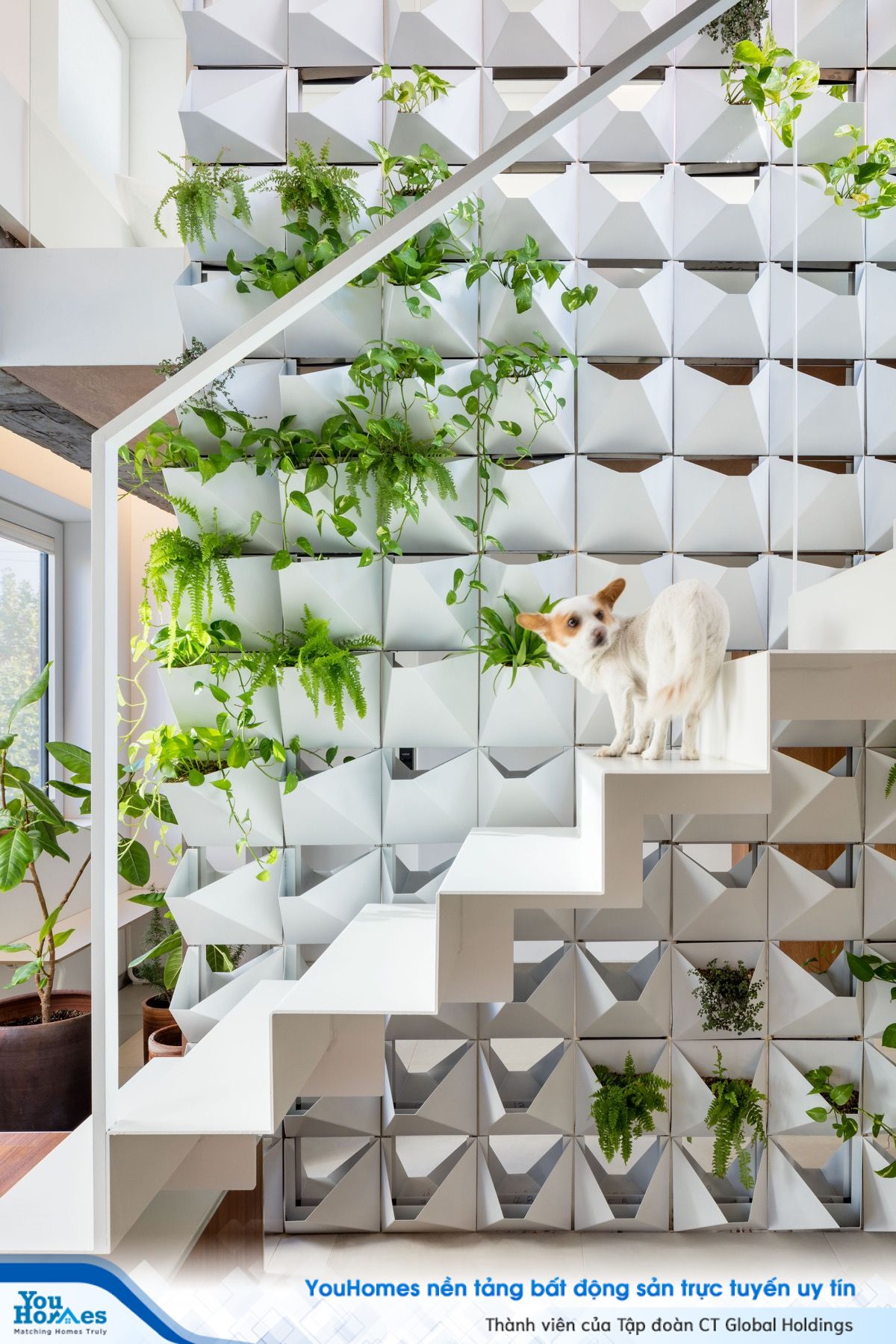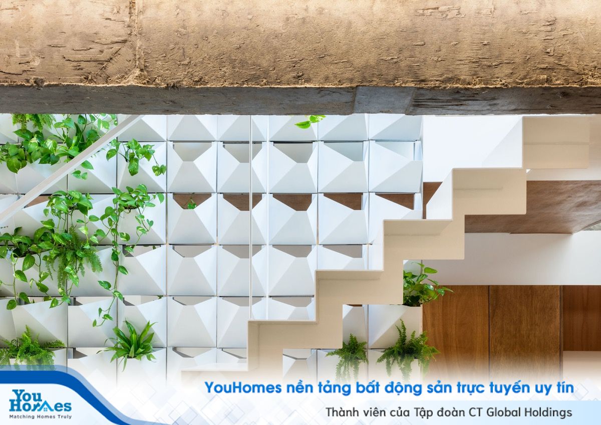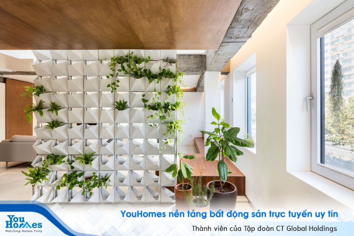 Bức tường xanh như một thảm thực vật tồn tại giữa căn nhà, đóng vai trò vừa là một điểm nhấn, vừa giúp điều hòa không khí cho căn hộ. Sự kết hợp giữa nét hiện đại và thiên nhiên một cách hoàn hảo và tuyệt vời.