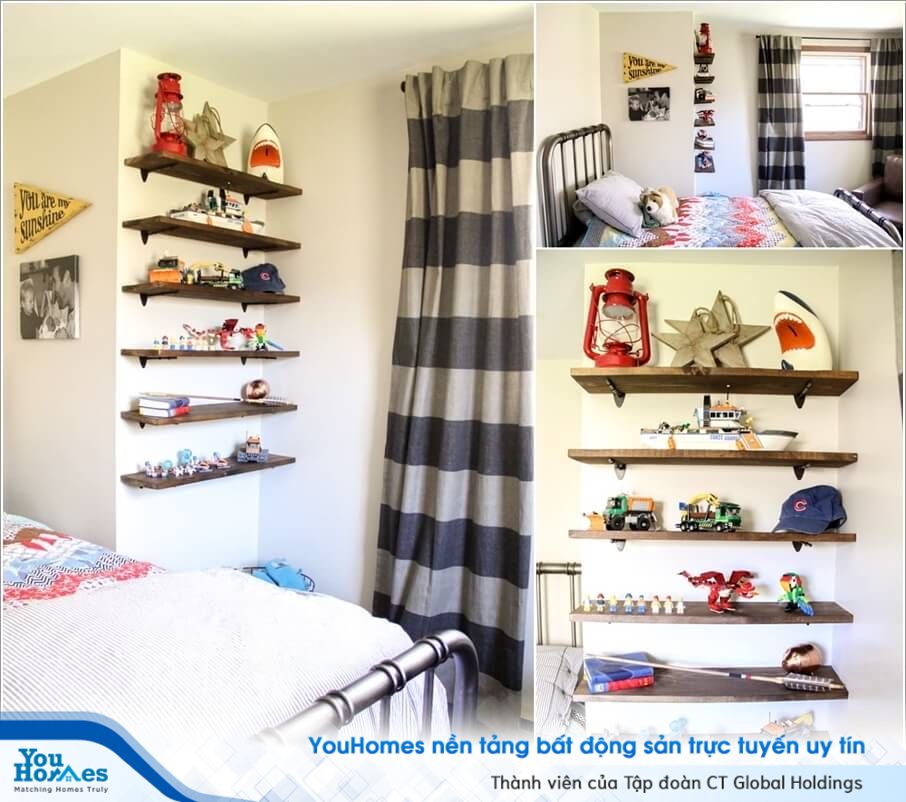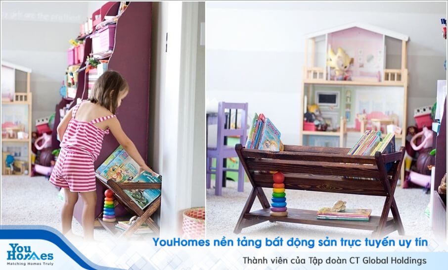 Trông phòng bé, kệ sách đáng yêu vừa tầm với của bé được ghép từ những thanh gỗ có thể kích thích bé hứng thú đọc sách hơn.