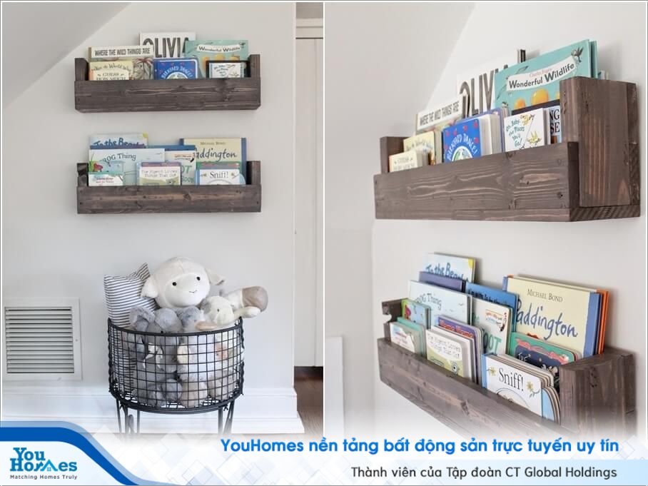 Với những bé thích truyện tranh hay đọc sách thì các bạn đừng bỏ qua ý tưởng này. Từ những thanh gỗ bạn có thể tái chế thành một kệ sách treo tường vừa tầm với của bé. Kệ sách giúp tiết kiệm được không gian lưu trữ trong phòng bé hơn. Kệ sách có thể được đặt tại các phòng nhỏ trong căn hộ của bạn giúp tiết kiệm được không gian.