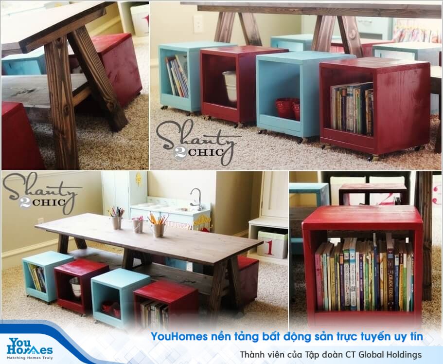 Một không gian cho bé vui chơi được bạn tạo ra từ những thanh gỗ thật đẹp. Chiếc bàn và những chiếc ghế nhiều màu sắc tinh nghịch để các bé có thể ngồi đọc sách hoặc tô màu. Những chiếc ghế được thiết kế thông minh để có không gian lưu trữ thuận tiện bên dưới giúp góc vui chơi của các bé luôn gọn gàng, ngăn nắp.