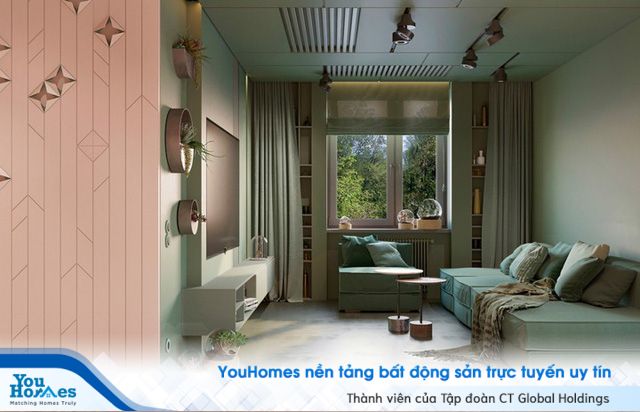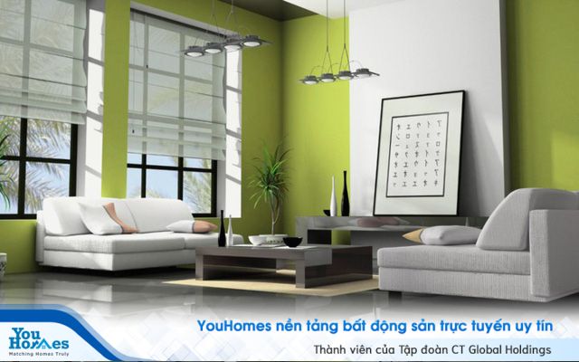 Trong mẫu phòng khách này, tường trông thật nổi bật khi sơn màu xanh lá cây, cùng với đó là các vật dụng màu trắng - đen và cách bố trí thêm cây cảnh đã góp phần tô điểm khiến phòng khách trở lên sang trọng hơn, đồng thời tạo cảm giác gần gũi, thư giãn và thanh tịnh.