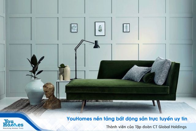 Bộ bàn ghế sofa màu xanh lá cây tạo nên không gian mát mẻ cho căn phòng. Tường nhà, sàn nhà, lọ hoa, tranh,...tất cả đều cùng tông màu xanh lá, phối hợp một cách hài hòa tạo nên tổng thể tuyệt đẹp. Một vài chậu cây được đặt trong phòng khách "ton sur ton" với các vật dụng khác tạo nên không gian mát mẻ cho căn phòng.