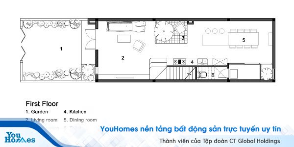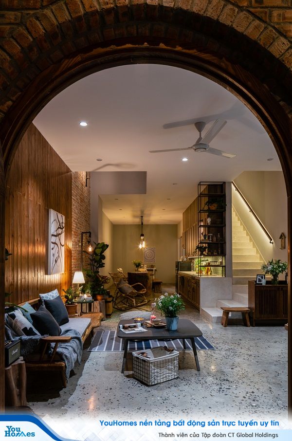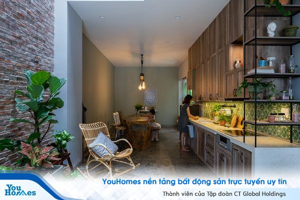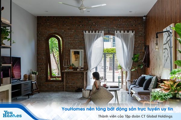 Bức tường bên trong nhà cũng được để thô tạo nên một không gian độc đáo. Bên trong nhà cũng được sắp đặt rất nhiều cây xanh giúp cho ngôi nhà luôn thoáng mát và có thêm sức sống.