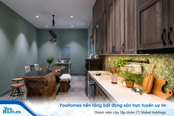 Căn bếp với dãy tủ bếp mang màu cổ điển cùng bới bàn ăn có thiết kế ấn tượng. Các dãy đèn được bố trí rất hợp lý, phù hợp với nhu cầu sử dụng và được bố trí ẩn bên rong tường hay bên trong tủ bếp. Cắp bếp cũng dành rất nhiều vị trí cho cây xanh giúp cho không khi luôn được thanh lọc.