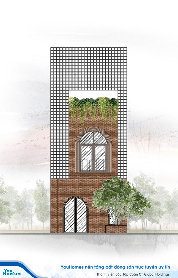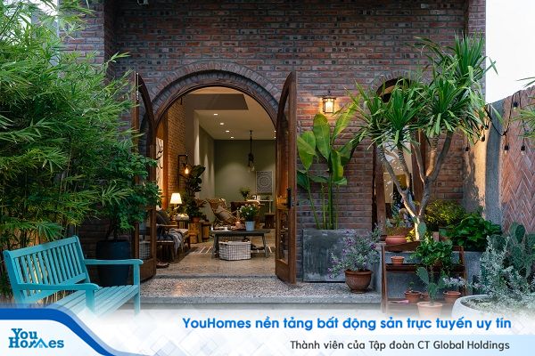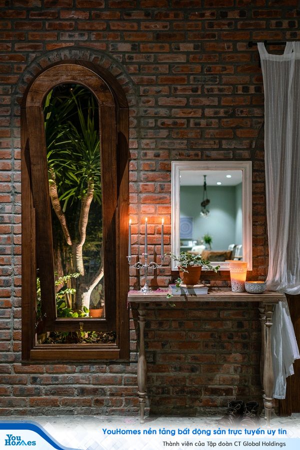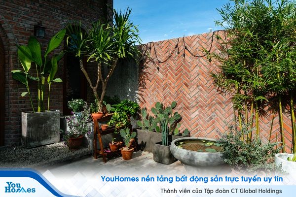 Ban công tầng 2 thơ mộng với thiết kế cây bao quanh tường gạch được để thô tạo nên một không gian thơ mộng pha màu cổ kính. Chậu hoa giấy nhỏ nhắn bên ban công giống như bước vào không gian cổ tích giữa đời thực.