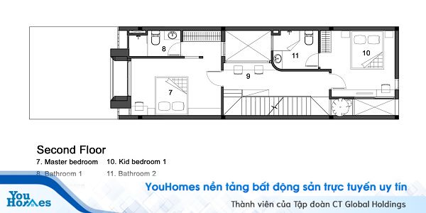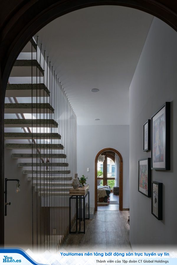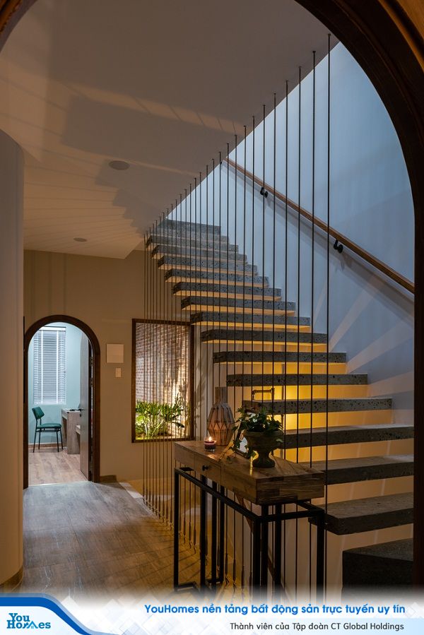 Phần cầu thang được ngăn cách giữa không gian hành lang bằng những sợi cáp chắc chắn và đẹp mắt lại giúp tổng thể trở nên thông thoáng hơn. Thiết kế các sợi cáp cực kỳ phù hợp với các căn hộ có trẻ nhỏ để đảm bảo an toàn.