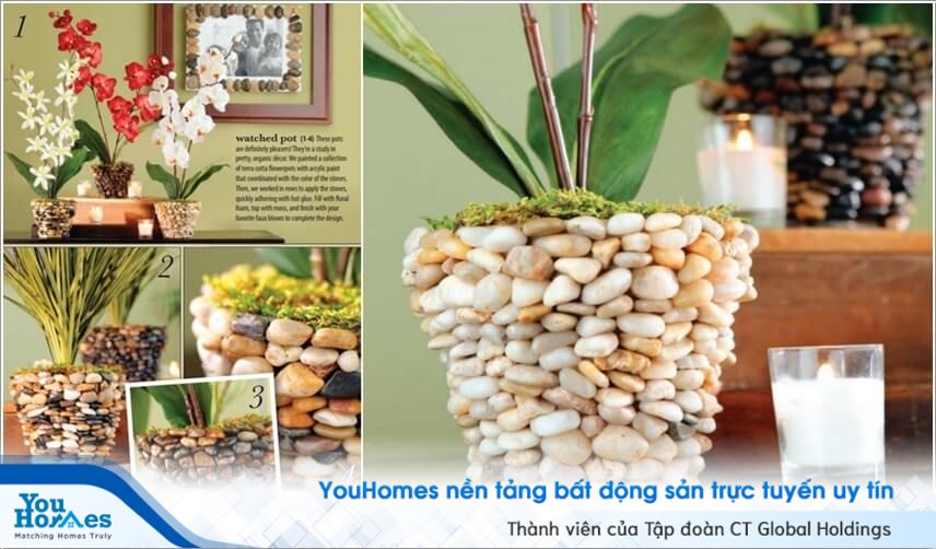 Chậu đất nung đơn giản chúng ta có thể hô biến chúng thành những chậu cây độc đáo bằng cách gắn các hòn đá nhỏ lên xung quanh chậu cây. Một cách đơn giản như vậy sẽ giúp cho những chiếc chậu trở lên độc đáo hơn.