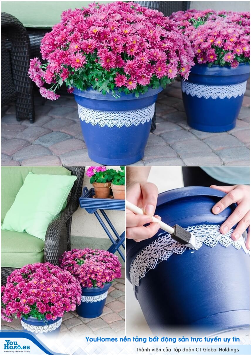 Nếu chậu cảnh của bạn có vẻ ngoài thô mộc, hãy thử “khoác áo mới” cho chậu cây của bạn bằng vải ren xem sao. Những chi tiết dịu dàng của tấm vải ren chính là cách trang trí tiết kiệm chi phí mà vẫn mang đến vẻ đẹp cuốn hút cho chậu cây đấy. Một tấm vải ren quấn nhẹ nhàng quanh chậu sẽ khiến chậu mang vẻ đẹp thanh tao mà không kém phần quyến rũ.