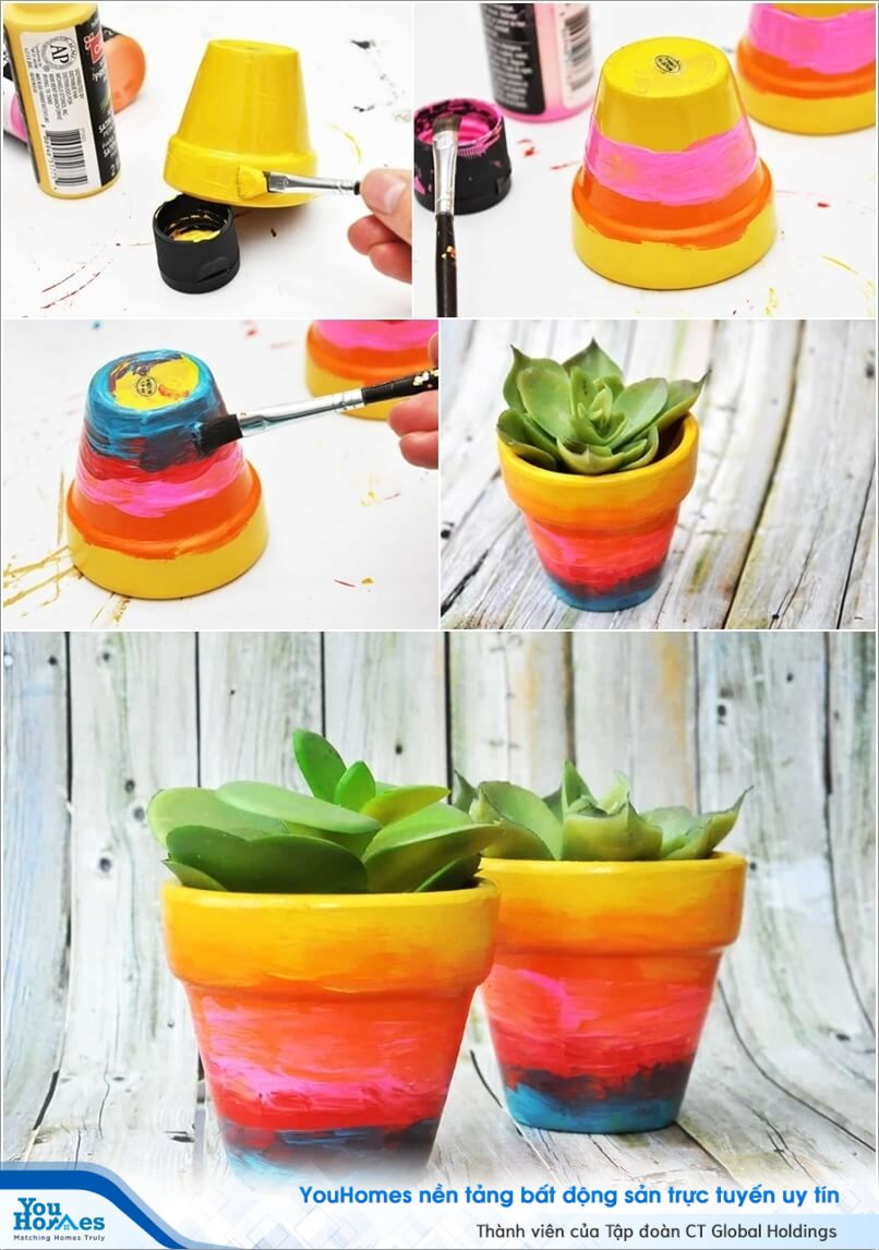 Căn hộ của bạn sẽ không còn nhàm chán nữa, bằng sự khéo léo của bạn hãy tạo ra những chậu cây thật đáng yêu. Sử dụng những màu sắc bạn yêu thích trang trí lên những chậu cây ấy tạo ra điểm nhấn độc đáo cho căn hộ của bạn. Những chiếc chậu câu nhỏ này có thể được trang trí trên bàn làm việc hoặc để ở trên cửa sổ.