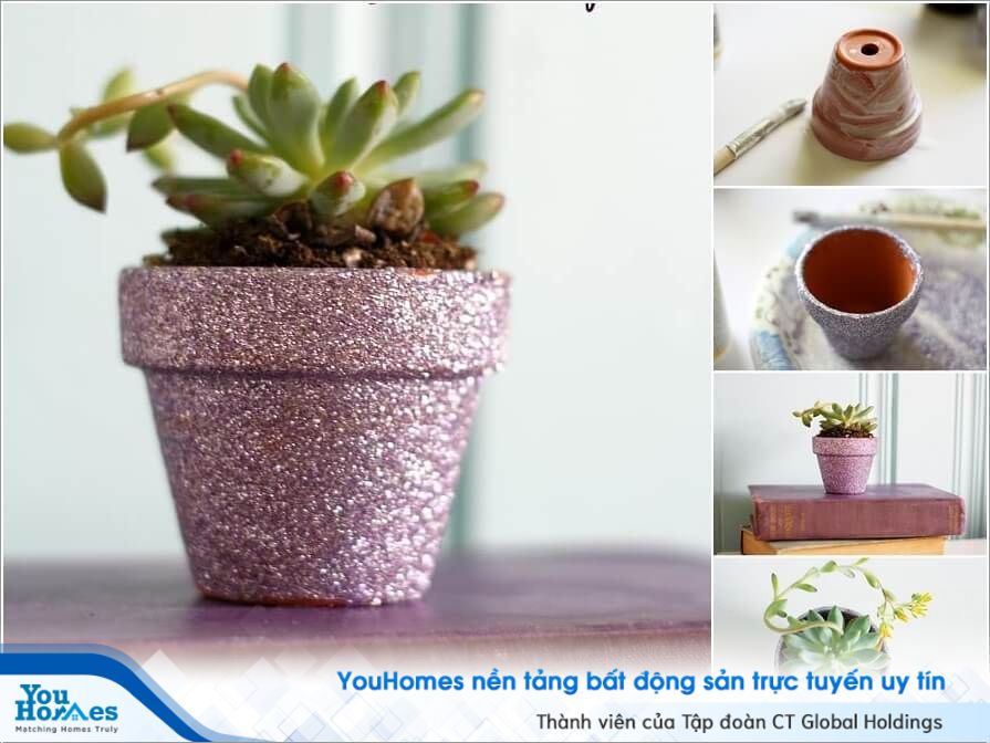 Những người yêu sự lấp lánh mộng mơ thì không thể bỏ qua ý tưởng sử dụng nhũ kim tuyến để trang trí cho những chậu cây cảnh. Dưới ánh đèn, những chậu cây được trang trí bằng nhũ kim tuyến sẽ lấp lánh rất thơ mộng.