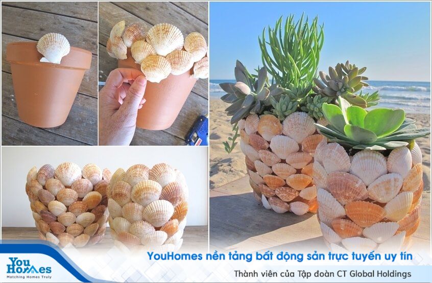 Cảm hứng từ biển khơi bất tận được đưa vào những chậu cây bằng cách gắn những vỏ sò xunh quanh chậu hoa tạo ra những nét riêng độc đáo, bắt mắt.