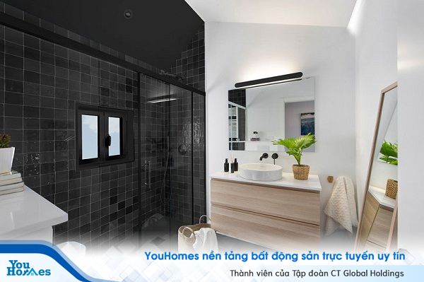 Phòng tắm nằm đối diện phòng ngủ được thiết kế với hai màu tương phản. Gạch đen vuông cho khu vực tắm và mảng tường đơn sắc trắng cho khu vực rửa mặt kết hợp trang điểm. Tủ, gương làm bằng gỗ tông màu sáng cho cái nhìn sạch sẽ, sáng sủa cho căn phòng.