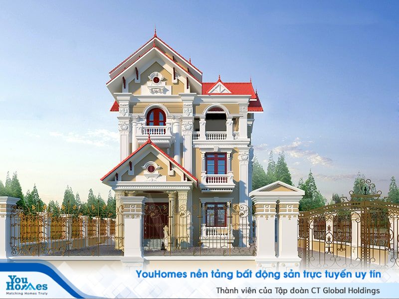 Tiếp tục là mẫu thiết kế nhà chữ L mang phong cách tân cổ điển sang trọng. Toàn bộ công trình được chăm chút kỹ lưỡng từng đường nét, họa tiết phù điêu tỉ mỉ đậm chất nghệ thuật . Các hệ trụ cột vững chãi cùng mái thái dốc cao nâng tầm đẳng cấp cho biệt thự.