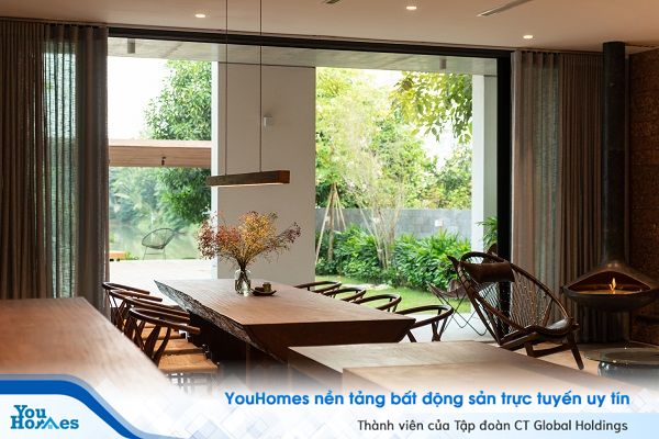 Phòng ăn và phòng bếp của ngôi biệt thự với thiết kế tối giản, giảm bớt tối đa sự cầu kỳ trong chi tiết giúp tổng thể hòa mình vào với không gian xanh bên ngoài.