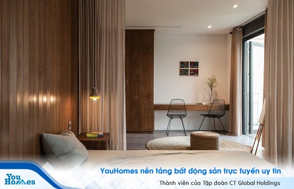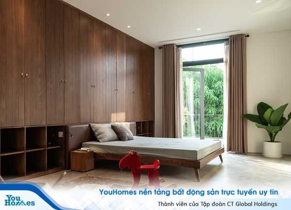 Phòng ngủ thứ 2 với phần tủ gỗ có nhiều ngăn giúp cất gọn đồ đạc một cách hợp lý.
