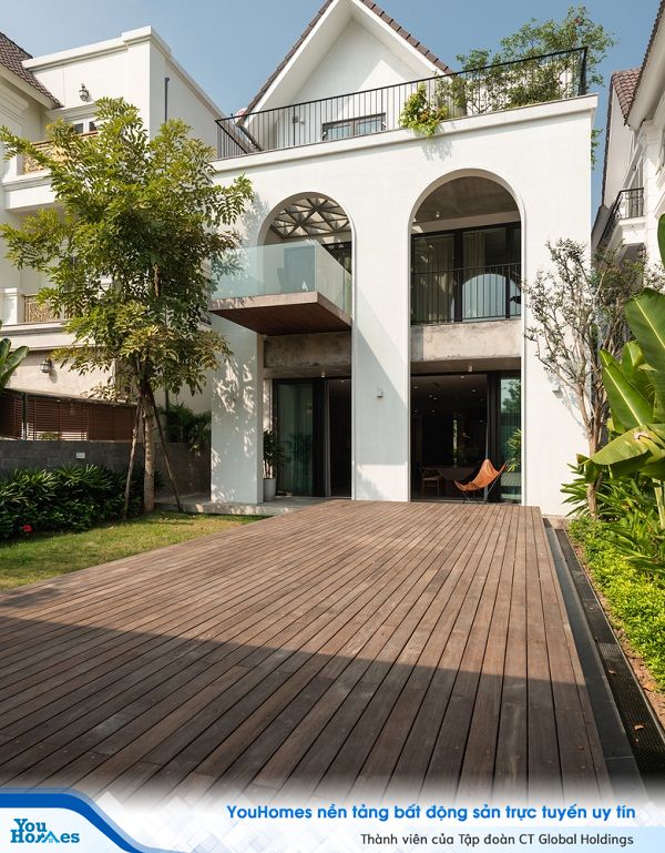 Mặt sau của căn biệt thự với phần sân được ốp gỗ sang trọng. Các dãy cửa đều được tận dụng làm bằng kính giúp căn nhà có thêm ánh sáng tự nhiên. Với thiết kế phần mái đặc biệt cho ban công giúp cho người sử dụng tránh được ánh nắng và có thêm không gian thư giãn.