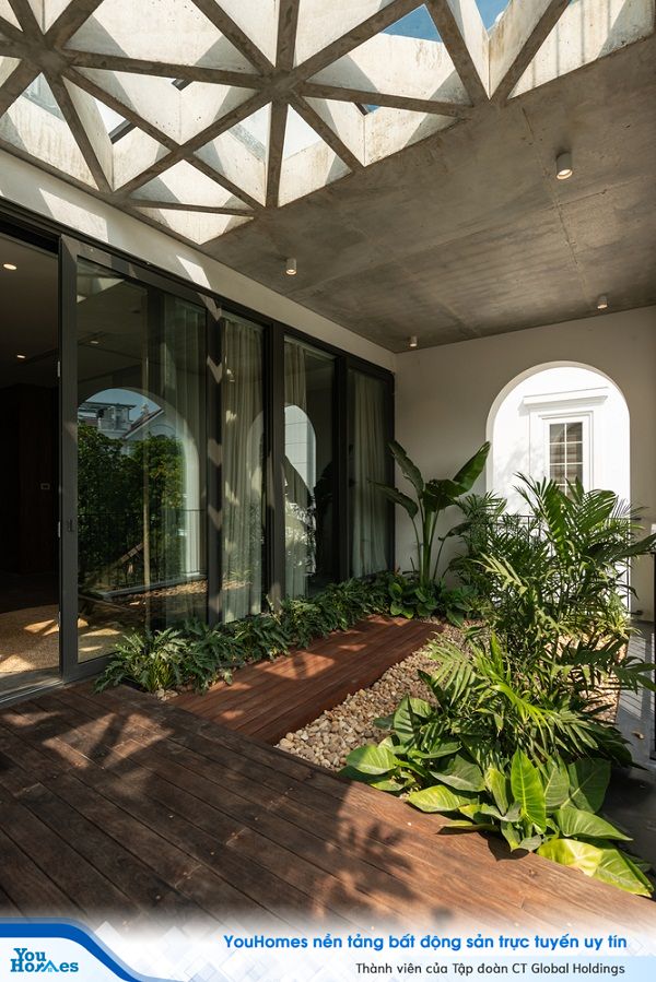 Ban công tầng 2 với thiết kế cây xanh xung quanh kết hợp cùng sỏi và sàn ốp gỗ cực kỳ hợp lý. Phần mái với thiết kế đặc biệt giúp tạo ra những mảng hắt sáng tuyệt đẹp cho phần sân vườn.