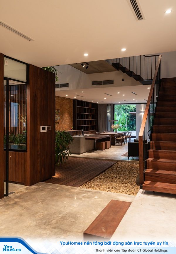 Không gian bên trong ngôi biệt thự cũng được kết hợp giữa sàn gỗ, sỏi và sàn đá với màu sắc cực kỳ hòa hợp. Đồ nội thất trong biệt thự được sử dụng phần lớn bằng gỗ với gam màu trầm tạo nên sự ấm áp. Phần trần biệt thự bên dưới cầu thang là hệ thống thông gió và đèn led được giấu khéo léo bên dưới lớp thạch cao.