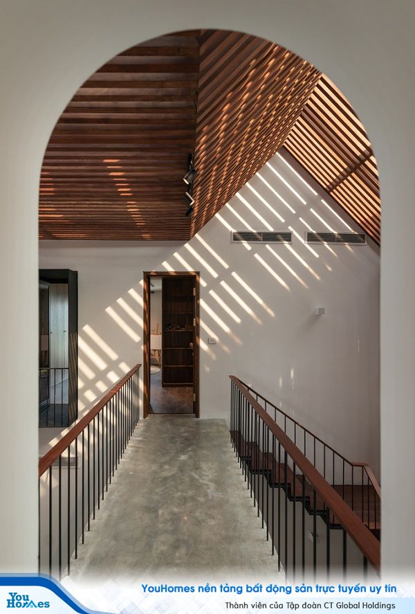 Phần giếng trời với thiết kế với những thanh gỗ đem lại mảng sáng tuyệt vời cho phần hành lang cầu thang tưởng như nhàm chán.