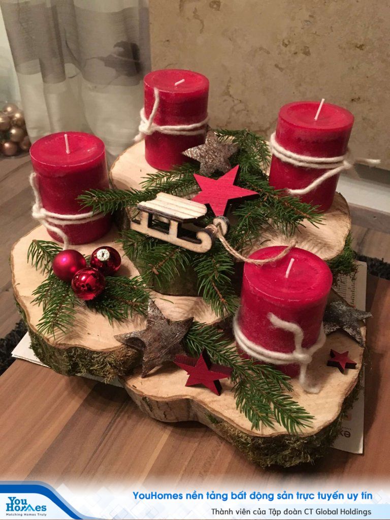 Không chiếm quá nhiều diện tích của căn hộ, sử dụng những ngọn nến đỏ lung linh cũng khiến lòng rộn ràng và vô cùng ấm áp. Tận dụng những mảnh gỗ để ghép lại thành kệ để nến trang trí nhỏ xinh. Khéo léo cắt ghép những mảnh gỗ lại để tạo ra những đế nên độc đáo sau đó những cây nến đỏ lung linh sẽ được đặt lên trên đó. Ngoài ra, để sinh động hơn còn có thể trang trí thêm những phụ kiện nhỏ như chiếc xe của ông già Noel, ngôi sao màu đỏ, những là thông màu xanh, vài hạt đỏ lấp lánh tạo nên một tổng thể vô cùng đẹp mắt.
