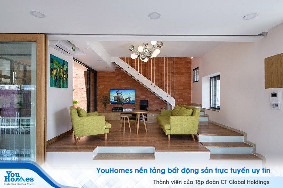 Phòng khách rộng và thoáng hơn với thiết kế chạy dọc hai bên tường. Bộ bàn ghế sofa màu xanh ngọc, chiếc bàn trà gỗ hình chữ nhật chạt dài, chạy song song cùng với kệ tường và tivi treo tường, tường được ốp đá tạo nên hiệu ứng thẩm mĩ không gian cao. Cầu thang được thiết kế gần kề với phòng khách và được ngăn cách bằng vách ngăn gỗ hiện đại.