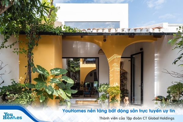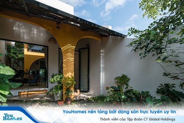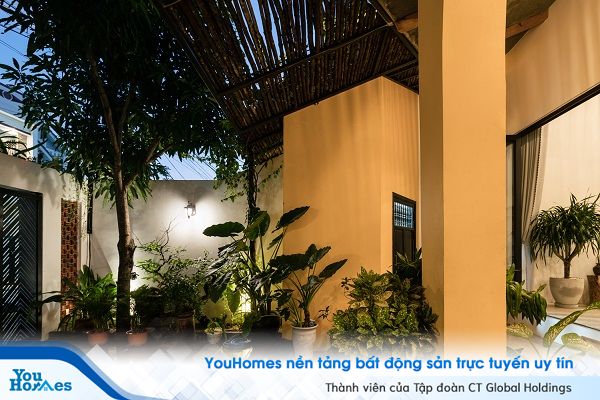 Khoảng sân vườn và thiết kế mang đậm nét cổ kính với sự xuất hiện của cây khoai đậm nét thôn quê kết hợp cùng màu sơn vàng và gạch nâu cổ điển.