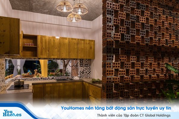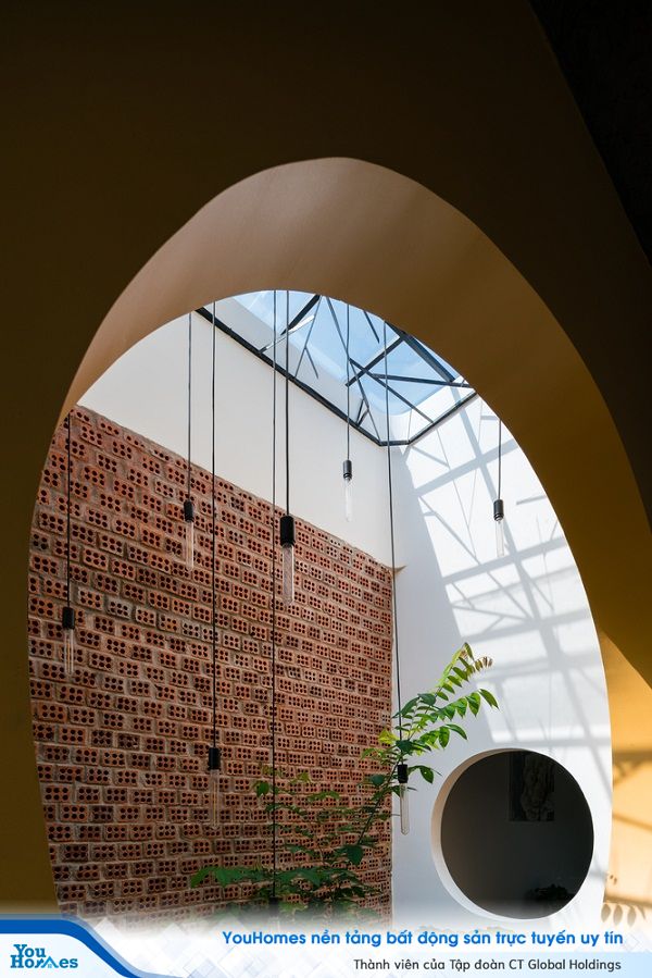 Thiết kế độc đáo của phần giếng trời với những bóng đèn treo cùng tường gạch lỗ. Phần cửa kính tại giếng trời có hình thù lạ, cách điệu từ những cành cây kết hợp cùng ánh nắng tạo nên những mảnh ánh sáng lung linh, tuyệt đẹp.