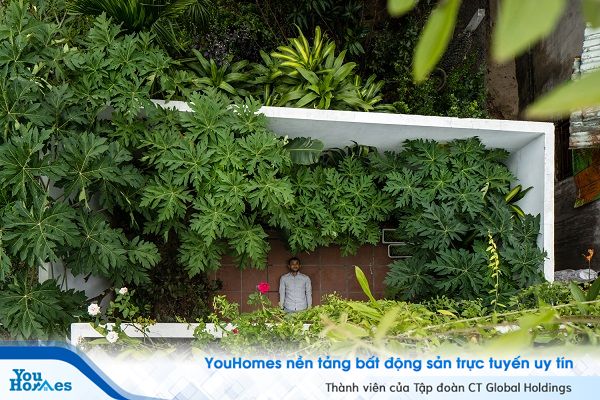 Bên ngoài ngôi nhà với vườn cây um tùm xung quanh tạo nên một không gian trong lành, tràn ngập màu xanh thiên nhiên.