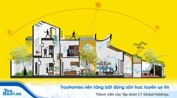 Thiết kế đặc biệt của căn nhà làm người sử dụng luôn có cảm giác được hòa mình vào với thiên nhiên với mật độ cây xanh dày. Tận dụng không gian mở làm cho mọi không gian được kết nối và thông thoáng.