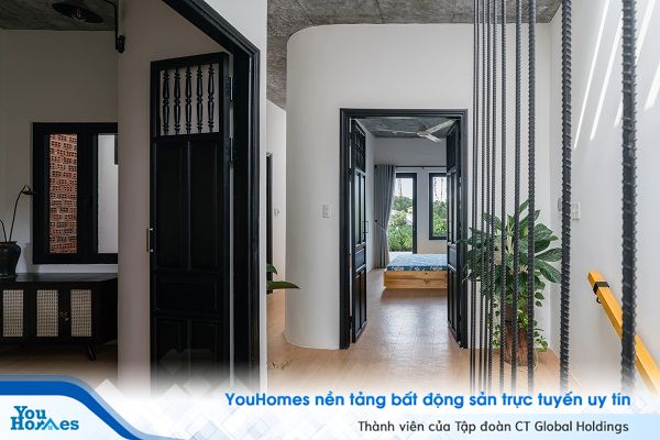 Phòng ngủ mang nét cổ điển với chiếc chiếu cói họa tiết cổ điển cùng chiếc tủ quần áo có gương phổ biến những năm 80. Phòng ngủ kín đáo được lấy ánh sáng từ lỗ tròn bên tường của phần giếng trời.