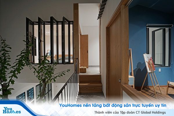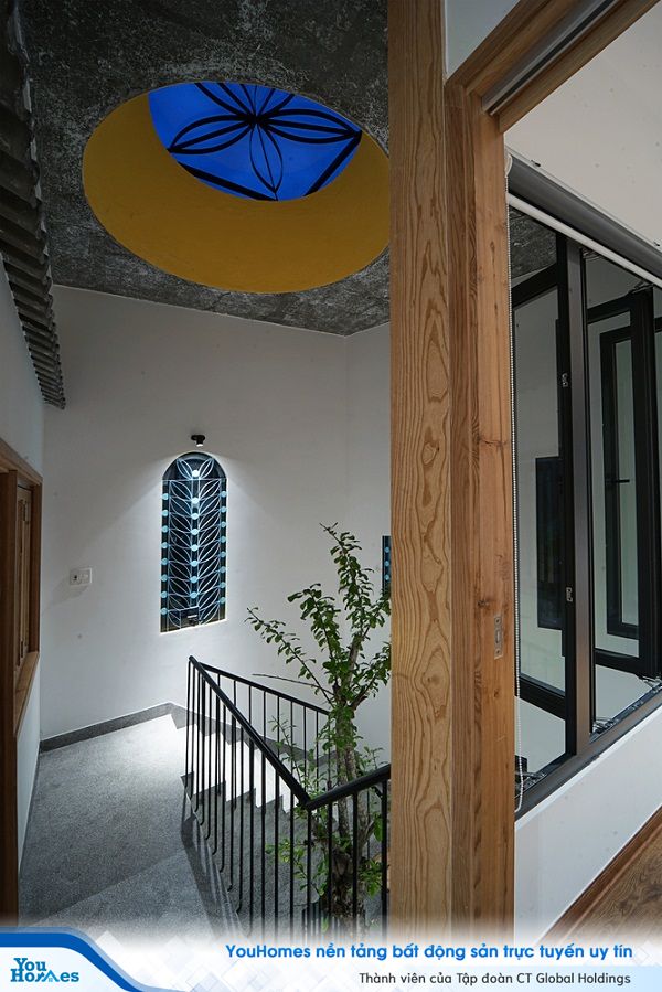 Giếng trời với thiết kế nhỏ nhắn và hình khối đặc biệt như những cánh hoa cúc cùng màu sơn vàng xung quanh làm điểm nhấn. Những ô của sổ như những chiếc lá xinh xắn tạo nên nét đặc biệt cho không gian cầu thang.