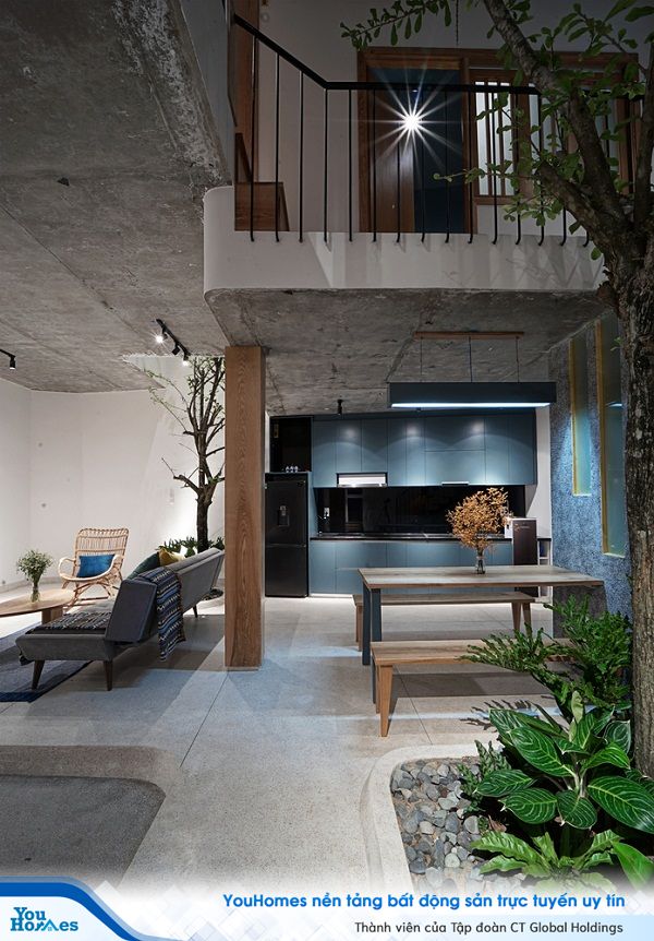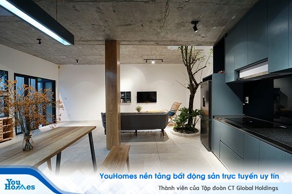 Bên trong căn nhà sở hữu thiết kế tối giản cùng trân bê tông được xử lý thô, làm cho không gian trở nên rộng rãi hơn. Các thiết kế gỗ ở bàn ghế và phần cầu thang giúp tổng thể trở nên ấm áp hơn, xua đi cái lạnh giá của những gam màu lạnh.