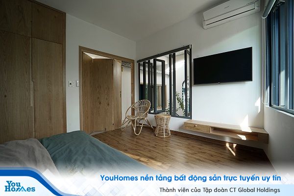 Phòng ngủ ấm áp được lát sàn gỗ cùng các đồ nội thất đều được sử dụng bằng gỗ với gam màu sáng.