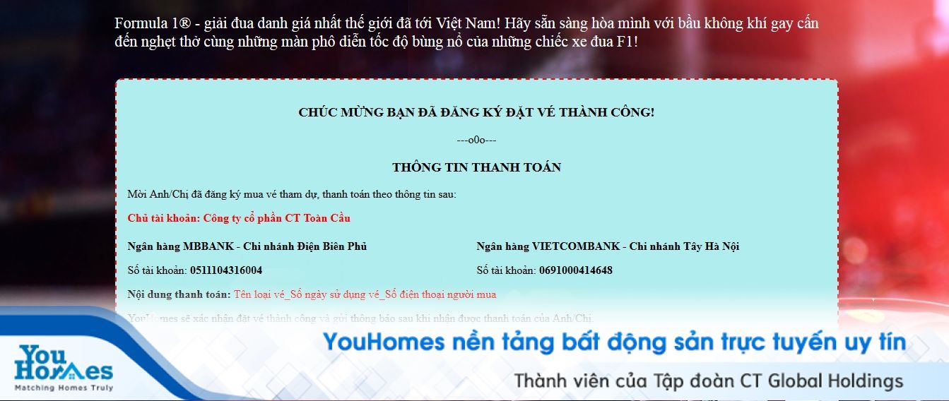Bước 2: Sau khi ấn "Đặt mua vé ngay" bạn sẽ thấy màn hình hiển thị thông báo đặt mua vé f1 thành công, sau đó làm theo hướng dẫn để hoàn tất thủ tục thanh toán.
