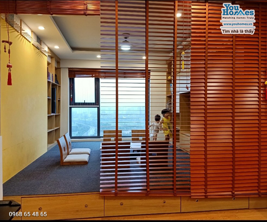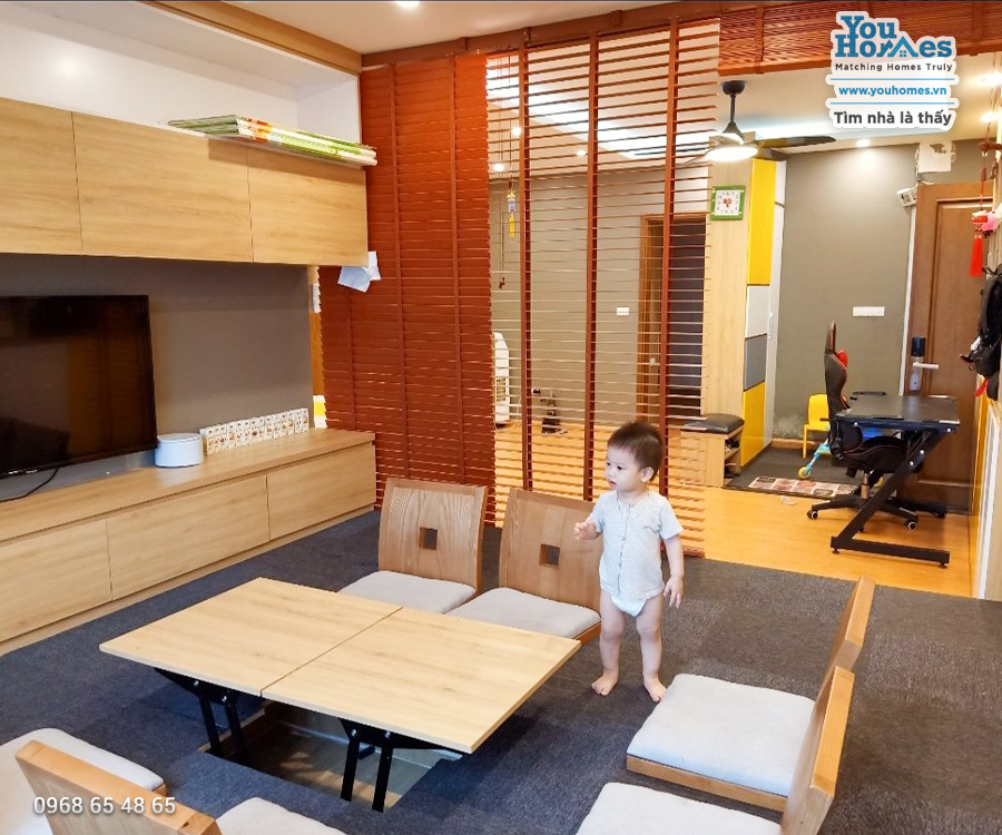 Trẻ nhỏ có thể chạy nhảy không sợ bị va chạm chấn thương như các kiểu thiết kế sofa bàn trà khác. Khi có nhu cầu muốn tiếp khách có thể nâng bàn âm lên. khi khách ở lại qua đêm thì phòng khách cũng là nơi để khách ngủ nghỉ, có rèm gỗ che tạo cảm giác kín đáo cho khách lẫn gia chủ. Bàn ăn có thể kéo dài ngồi được đến 12 người. Căn hộ thoáng mát nhiều gió thổi, ít khi cần điều hoà.